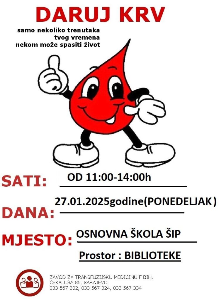 JU Osnovna škola “Šip” u saradnji sa Zavodom za transfuzijsku medicinu FBiH organizira dobrovoljnu akciju darivanja krvi.
